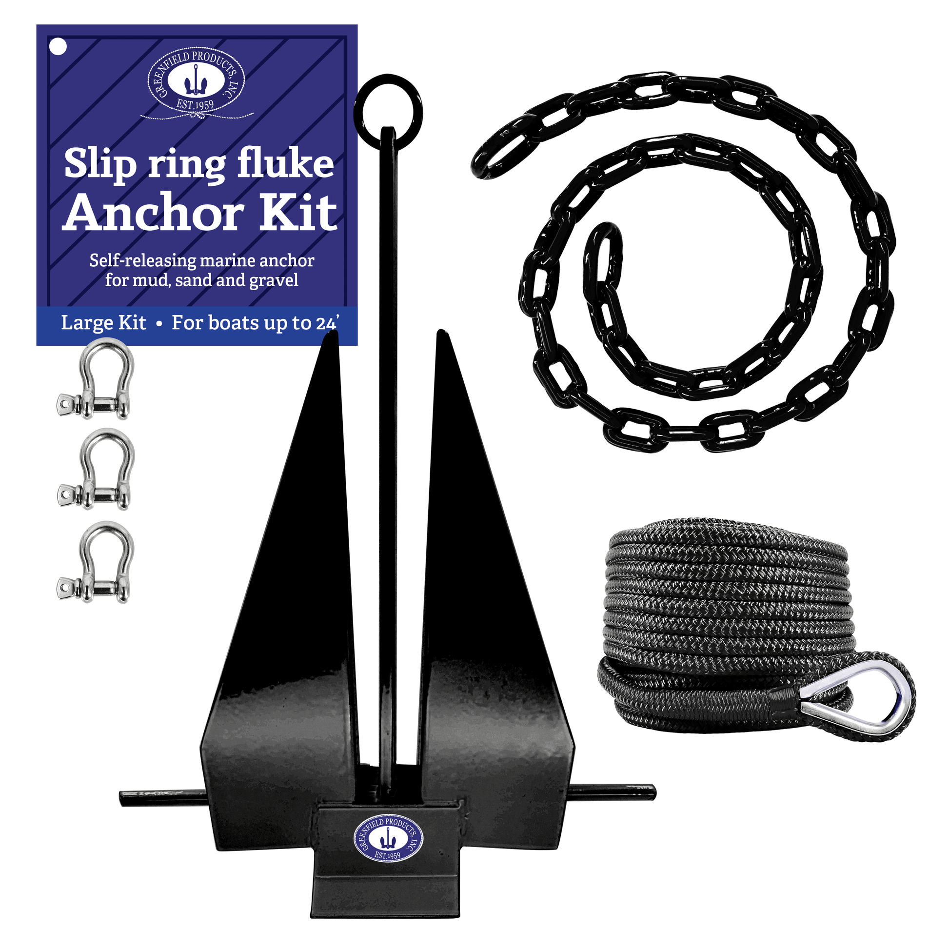 Greenfield Complete Boat Anchor Kit (Up to 16' and 24' Sizes) Comes with Fluke Anchor, Anchor Chain, Anchor Rope, Shackles. Black Coated Fluke Kit. Boat Accessories Marine